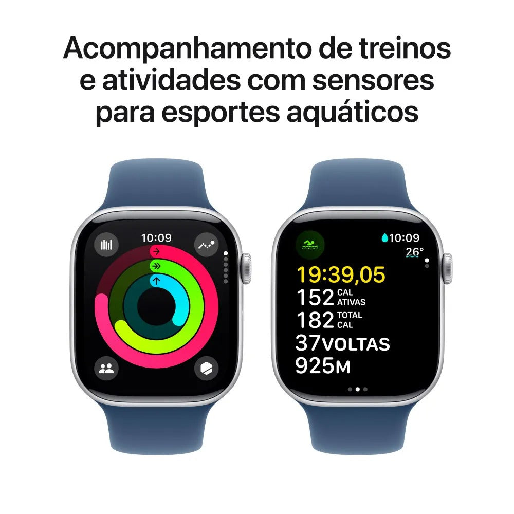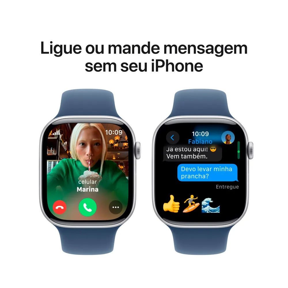 Apple Watch Series 10 (GPS + Cellular 46 mm) Caixa de Alumínio Prateada, Pulseira Esportiva Denim P/M