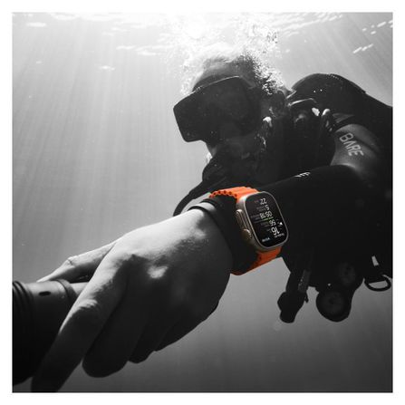 Caixa de titânio de 49 mm resistente à corrosão. Digital Crown ampla e botão de Ação configurável para acessar num instante diversas funções. Resistente à água até 100m (5).