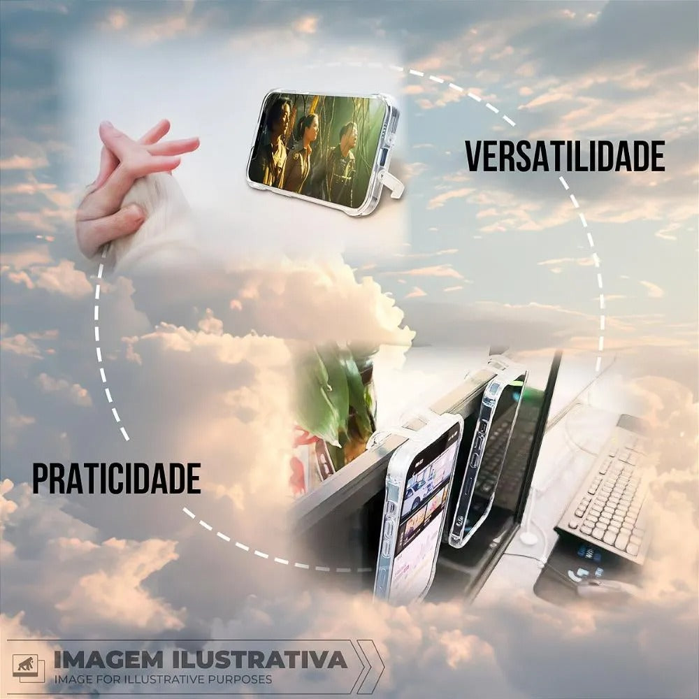 Conta com suporte retrátil invisível integrado para apoio em superfícies planas e ganchos discretos nos quatro cantos, permitindo pendurar o aparelho ou adaptar ao seu estilo de uso. Certificada com padrão US Military, oferece máxima proteção sem comprometer a estética.