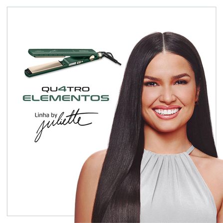A Prancha Alisadora da Linha by Juliette Qu4tro Elementos traz um revestimento especial enriquecido com infusão de Cerâmica, Titânio, Tourmaline e Nano Silver. Esses 4 elementos, juntos, protegem seus fios e garantem uma aparência mais saudável aos cabelos, com brilho intenso, maciez e sem frizz. Saiba mais sobre a Prancha Alisadora P-JU-02: